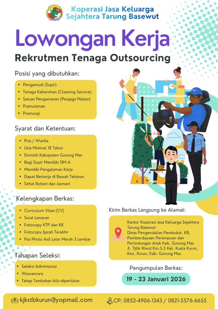 Koperasi Jasa Keluarga Sejahtera membuka kesempatan bagi Anda untuk bergabung sebagai Tenaga Outsourcing dengan posisi berikut: